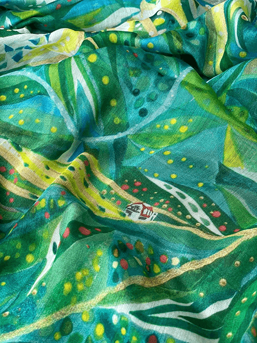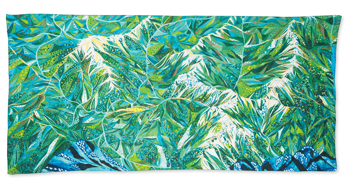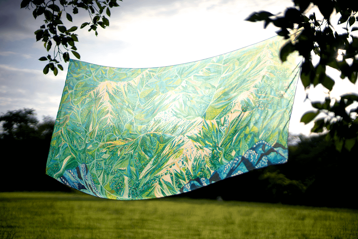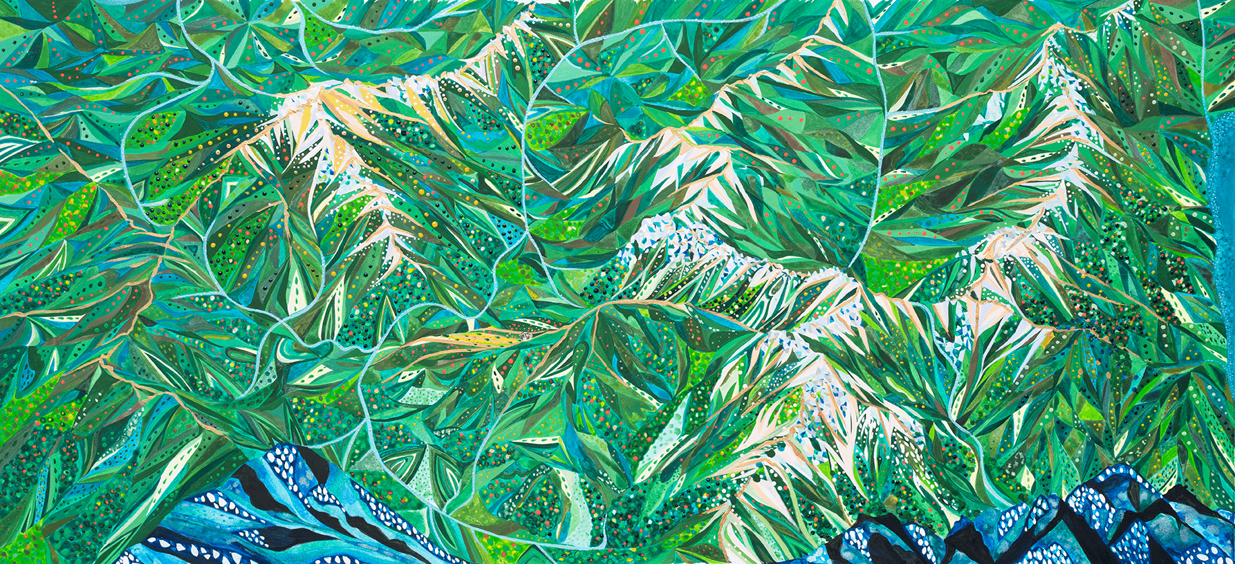 登山、スノーボードなどのアウトドアスポーツを通じて自然の中で感じる五感の素晴らしさに感動し、描くことで自然と人との関わりがさらに深い繋がりになることを思い「自然と人」との暮らし・遊びをテーマに模様の要素を取り入れた自然風景を描いている。