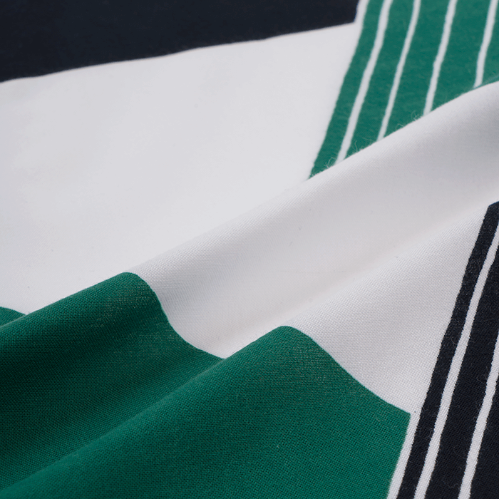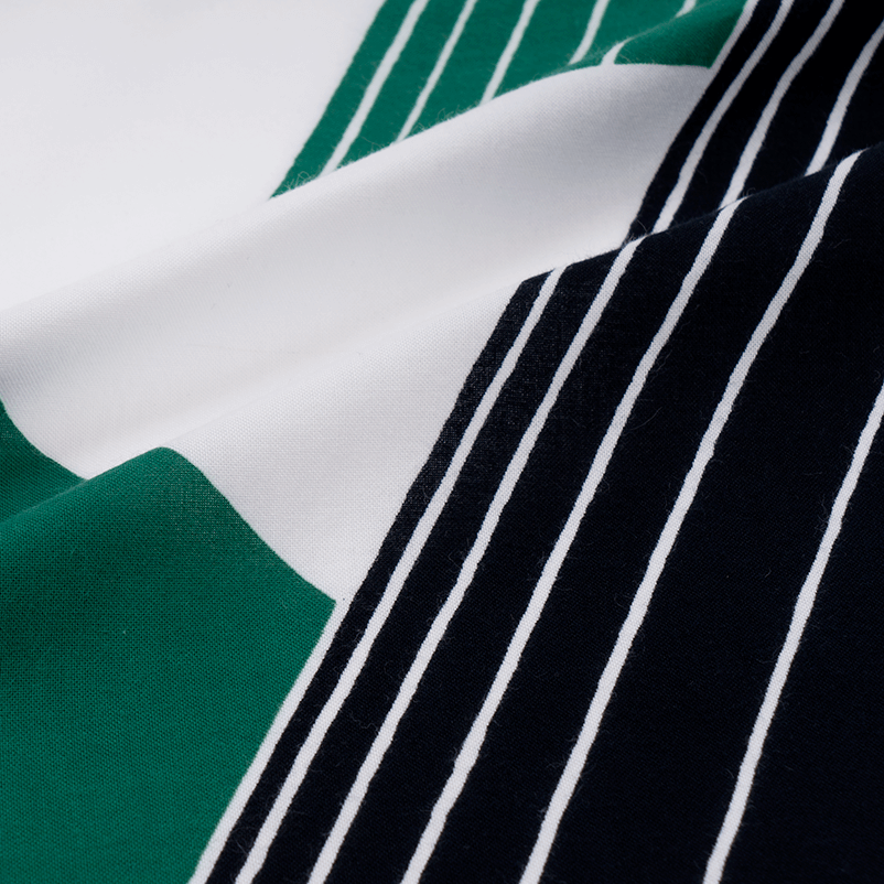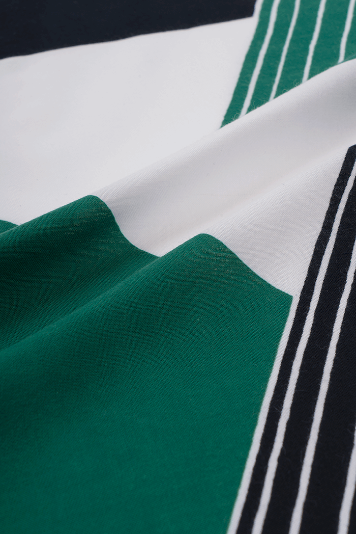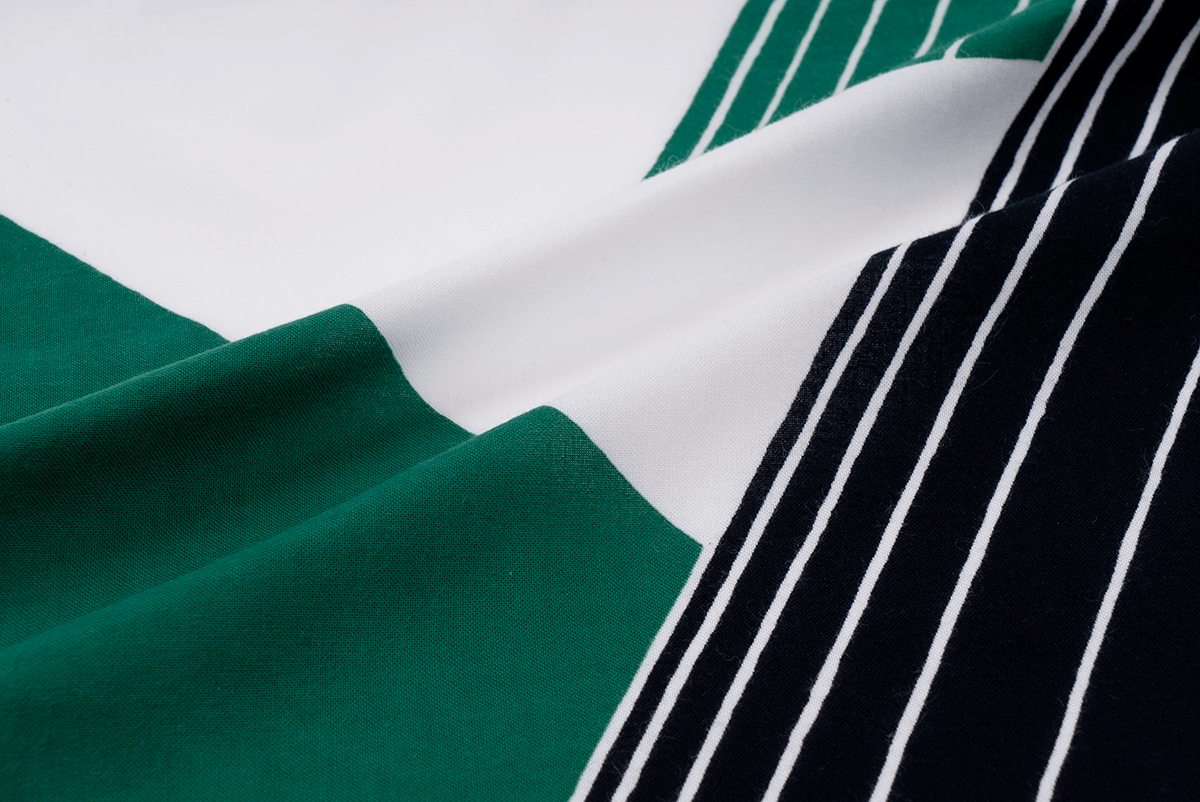 幾何学的なデザインの中に手描きの有機的な線が柔らかな調和を与え、緑と黒、白地の大胆な配色によって、黒部の渓谷に連なる山々の稜線が力強く浮かび上がります。