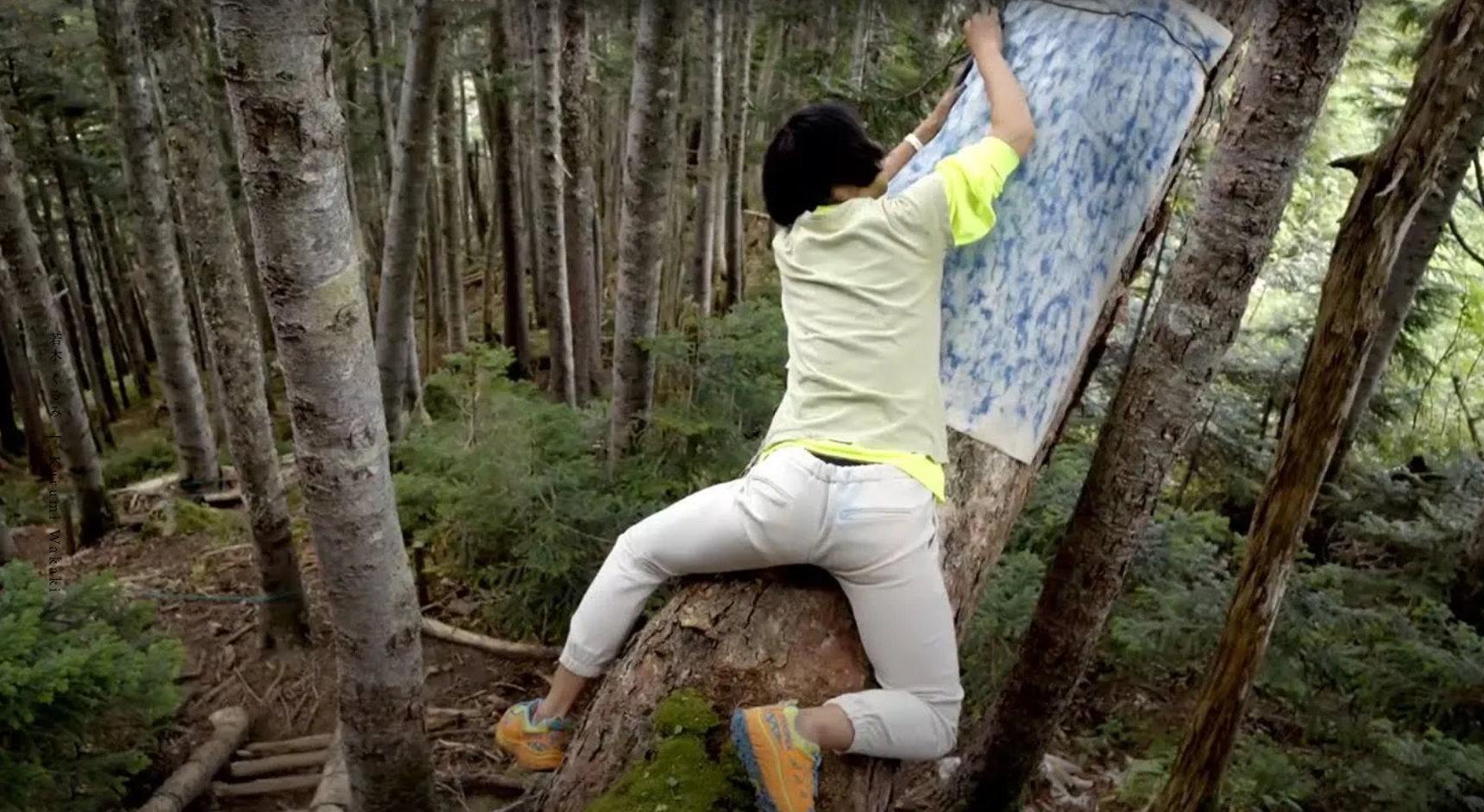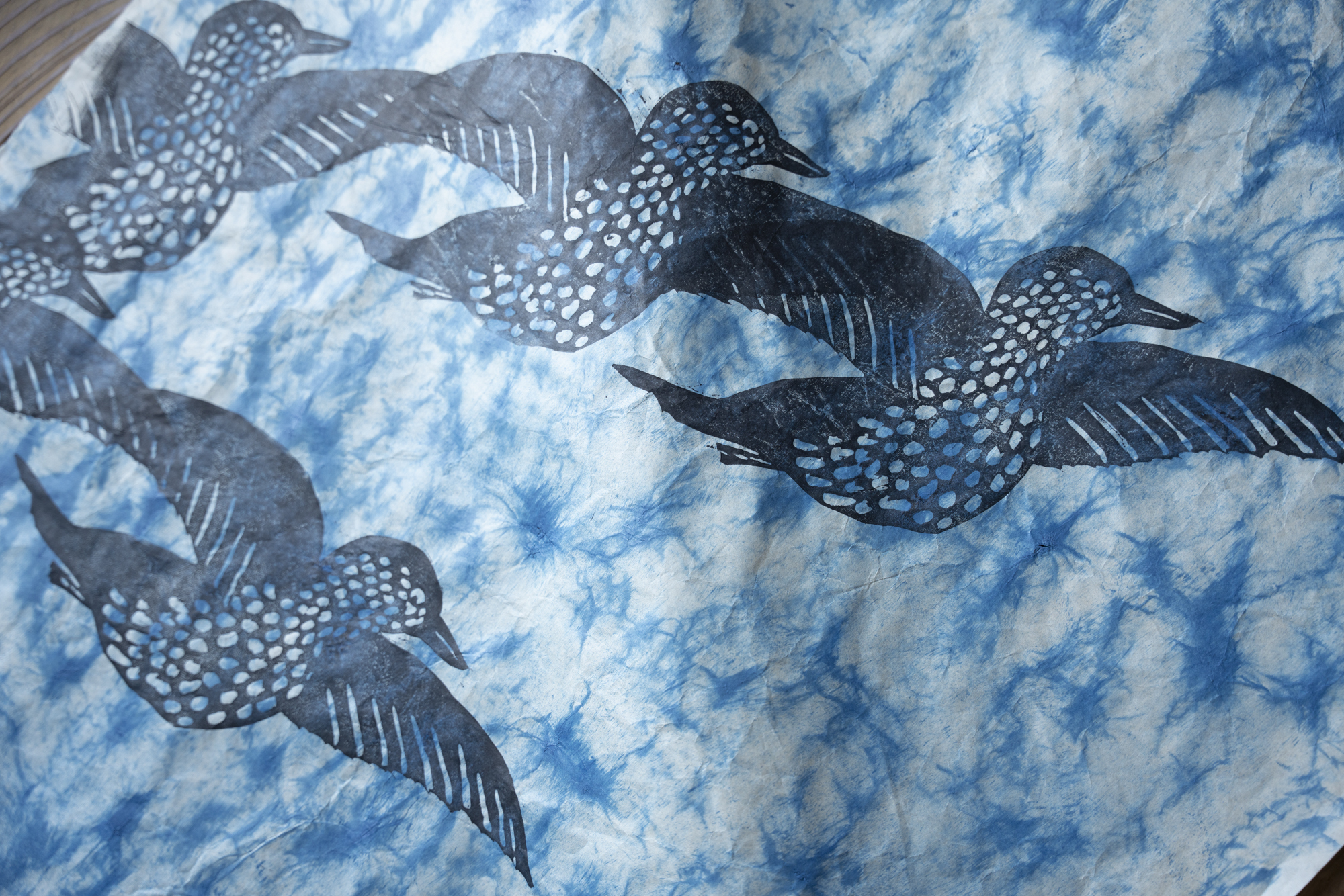 オリジナルアートは2020年雲ノ平AIR参加アーティスト、若木くるみさんが制作した「森版画」。トウヒの樹皮の模様を写しとった「青空」の中を、木版のホシガラスが軽やかに羽ばたいていく様を描いた作品です。プリントが難しいDFCに、2年越しで開発した独自の技術を使い高精細で耐久性の高いプリントを実現しています。